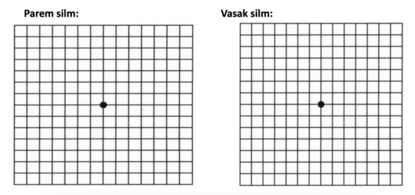 Kui jooned ruudustikul ei ole sirged või näed tumedaid/heledaid laike või jooni katkendlikult, on Sul põhjust pöörduda silmaarsti juurde.